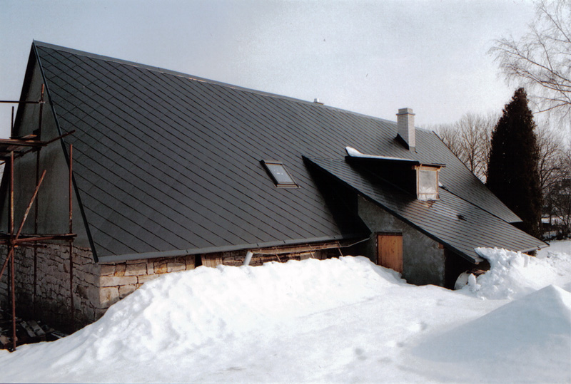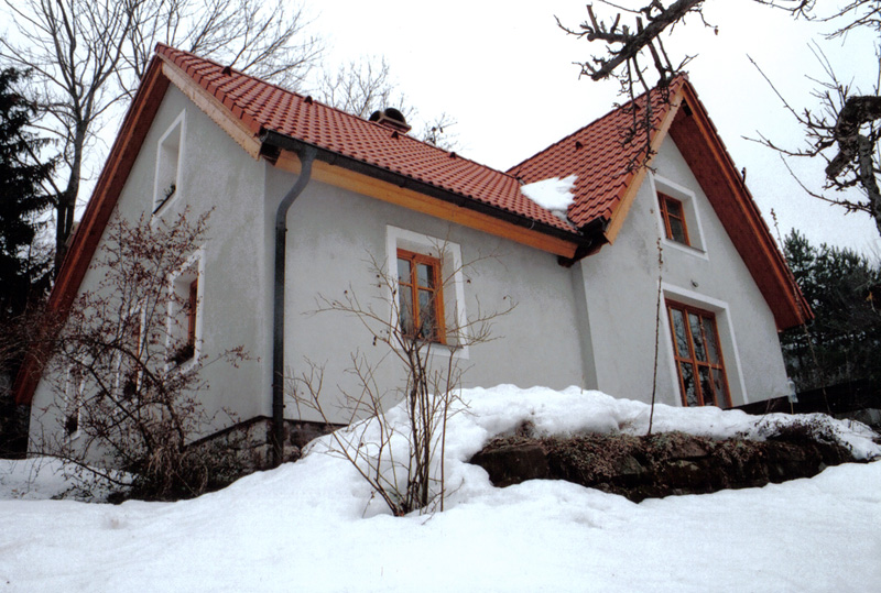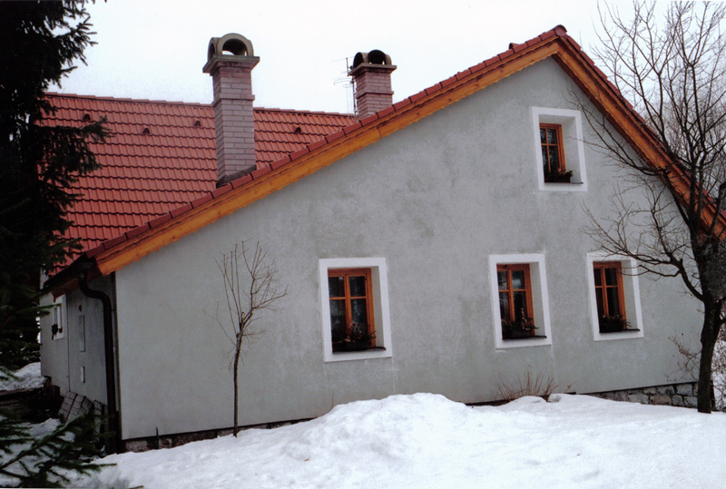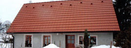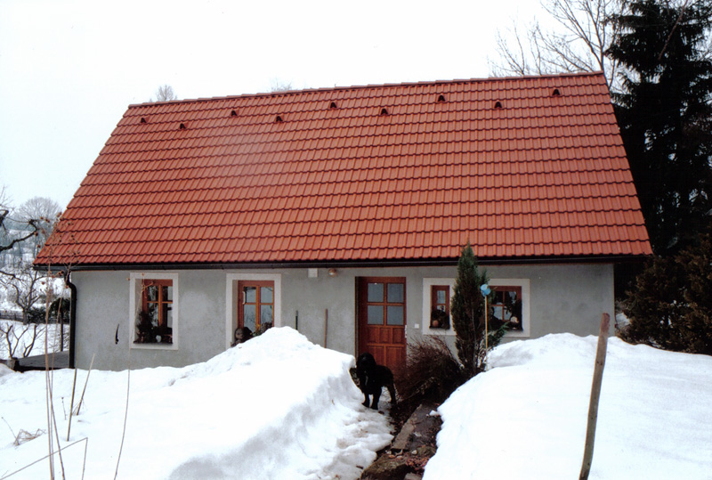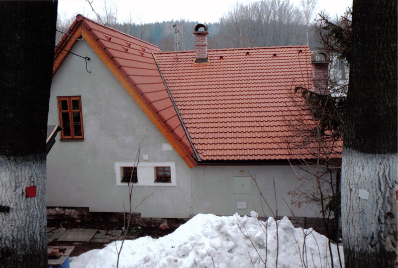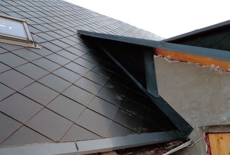 Pro zachování optického vzhledu střechy byl použit materiál totožný s původní krytinou - Cembrit. Plechování z hliníku, střešní okna Velux